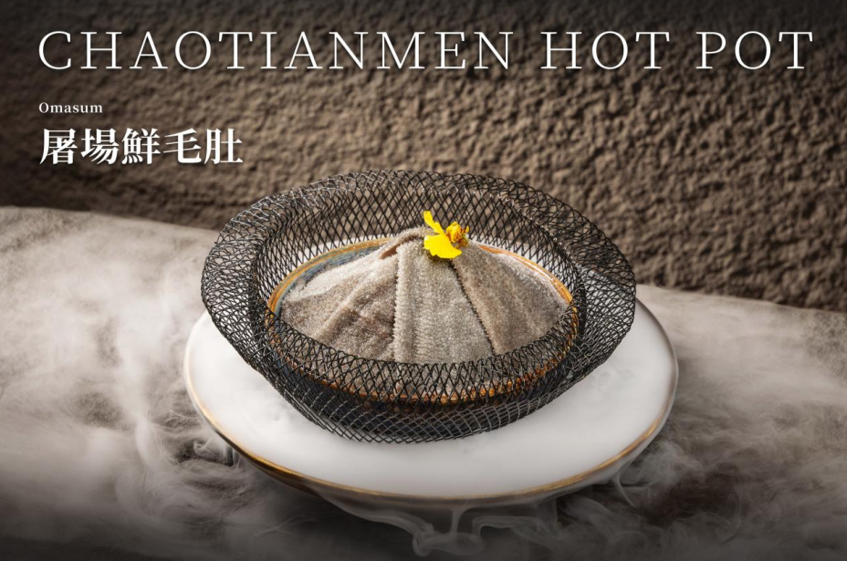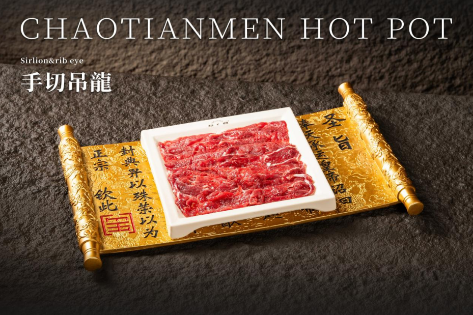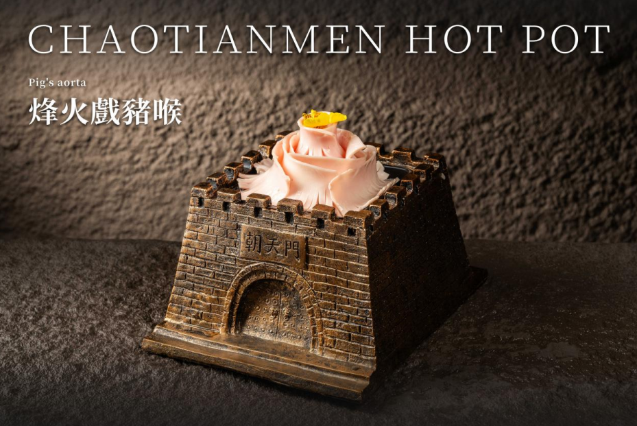 「朝天門火鍋」的菜品不少都帶有彷如頒布詔書的濃厚儀式感,如經典菜品「手切吊龍」,上菜時用聖旨端著,非常有排場。吊龍是牛脊背上的一條長肉,接近牛頸脊的位置,占全牛比例僅4%,為多款位置中肉味最濃的部位,油份較重,肉質彈牙。另一道人氣菜品,將黃喉置於烽火臺之上,引經據典取名為「烽火戲豬喉」,豪爽夠霸氣,黃喉口感爽脆彈牙,帶淡淡肉香。