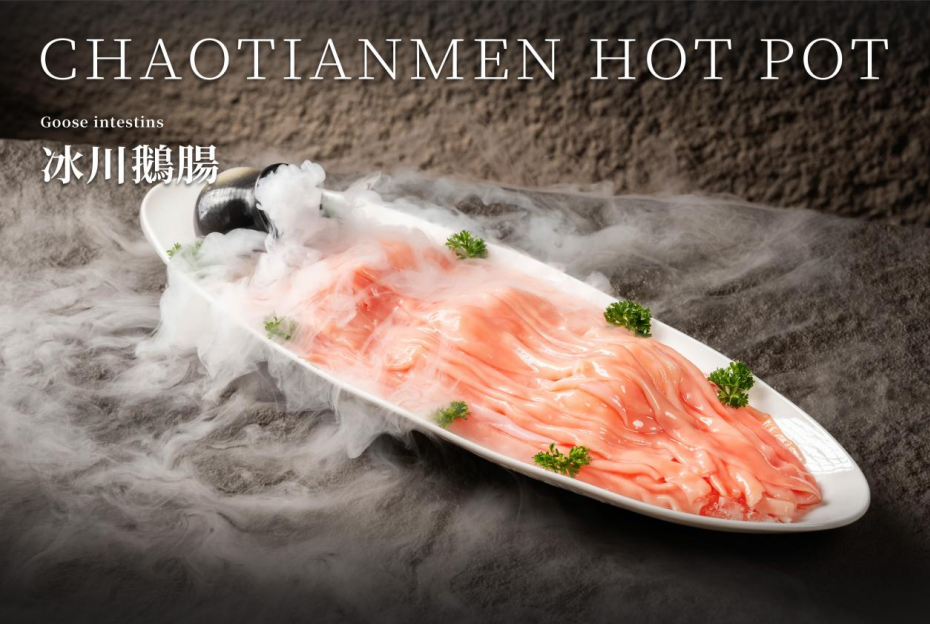 毛肚是重慶火鍋最主要的食材之一,有指重慶人一日能消耗下十萬斤毛肚,是重慶火鍋的頭牌?!竿缊鲺r毛肚」毛肚經精心挑選,肉厚而脆,入口筋道彈牙,蘸點醬料伴吃風味絕佳。重慶人對鵝腸的喜愛不亞於毛肚,「冰川鵝腸」選取新鮮肥美的鵝腸以冰鎮上桌,配搭紅油鍋底濃郁香味,口感爽脆富油香有嚼勁。
