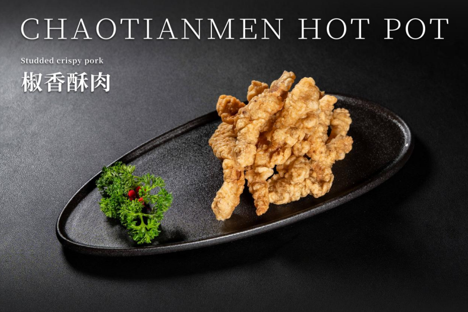 正宗重慶人在火鍋沸騰前多會點一份炸酥肉作開胃小吃。朝天門火鍋的「椒香酥肉」以五花肉為主料,蘸上蛋漿即炸,表面再撤上麻椒顆粒,香脆可口,味香爽麻,令人回味無窮??杉词骋部煞湃牖疱佒袪C煮,吸入辣汁後肉質香辣軟腍,雙倍滋味。